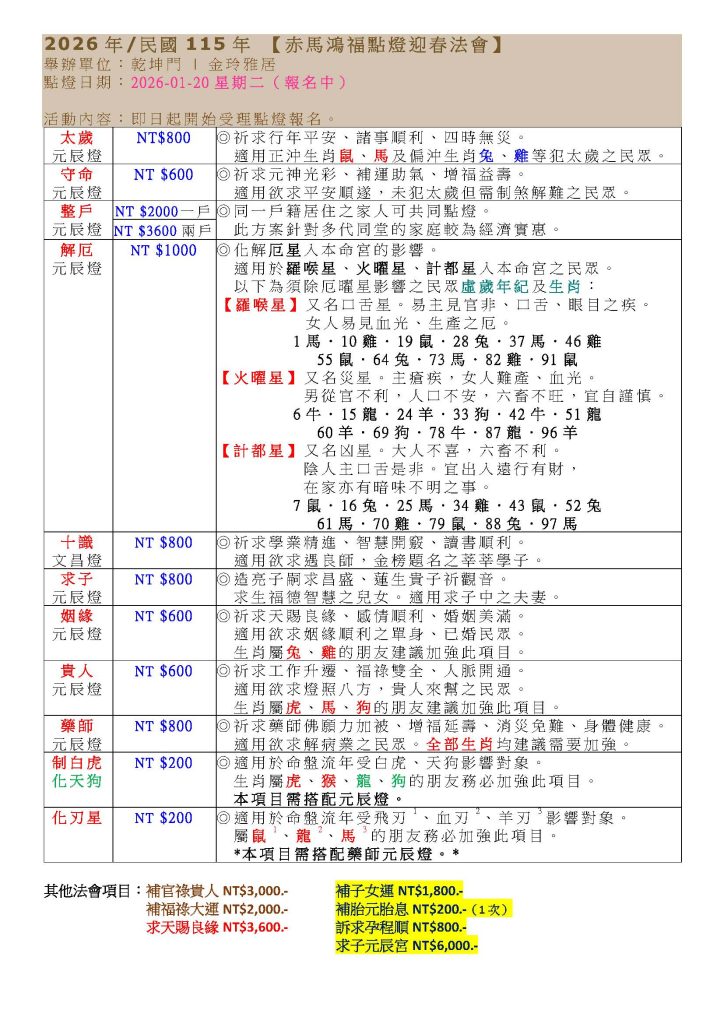 2026歲次丙午赤馬鴻福祈福安歲點燈法會簡章